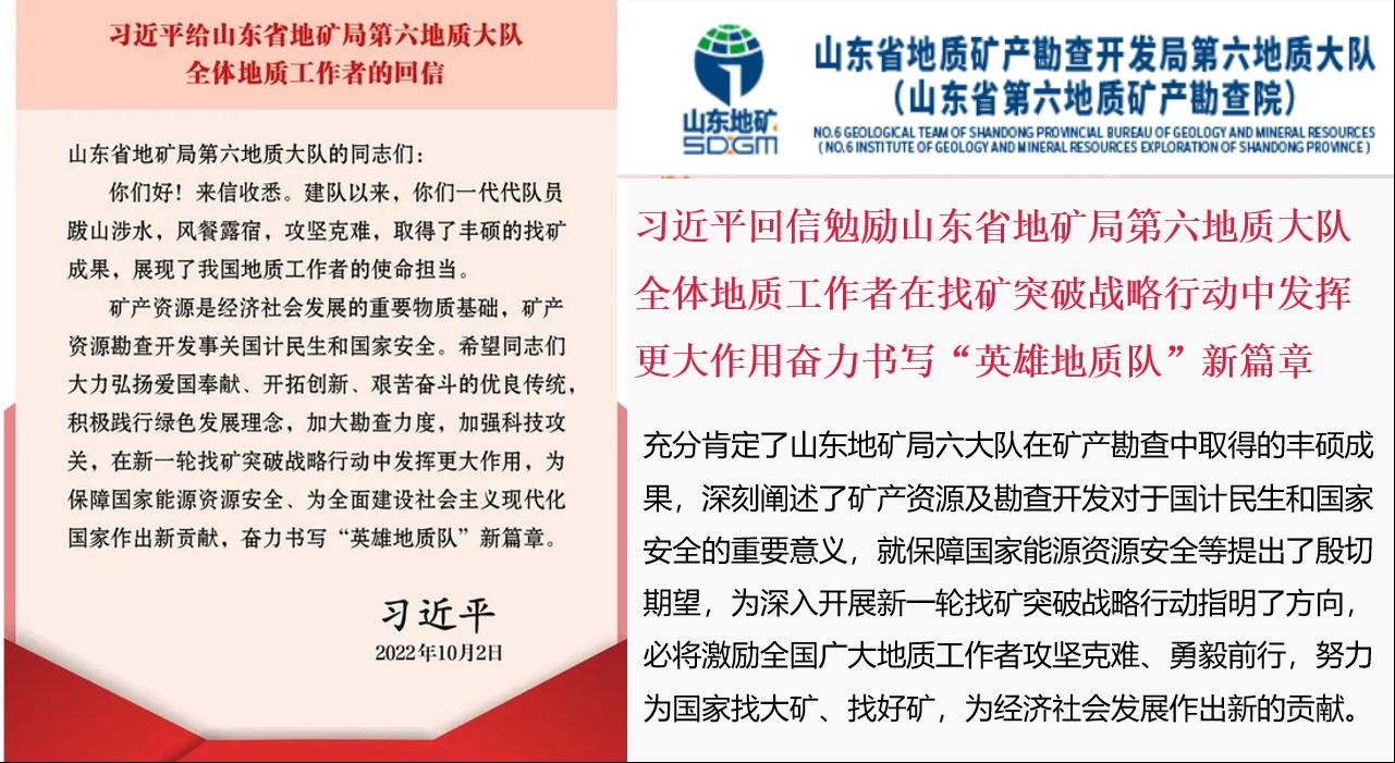 2022104日,中国中央广播电视台《新闻联播》节目开篇专题报道了习近平总书记102日给山东省地矿局第六地质大队全体地质工作者回信,并发布央视快评《奋力书写“英雄地质队”新篇章》。总书记在回信中充分肯定了山东地矿局六大队在矿产勘查中取得的丰硕成果,勉励同志们大力弘扬爱国奉献、开拓创新、艰苦奋斗的优良传统,积极践行绿色发展理念,加大勘查力度,加强科技攻关,在新一轮找矿突破战略行动中发挥更大作用,为保障国家能源资源安全、为全面建设社会主义现代化国家作出新贡献,奋力书写英雄地质队新篇章。