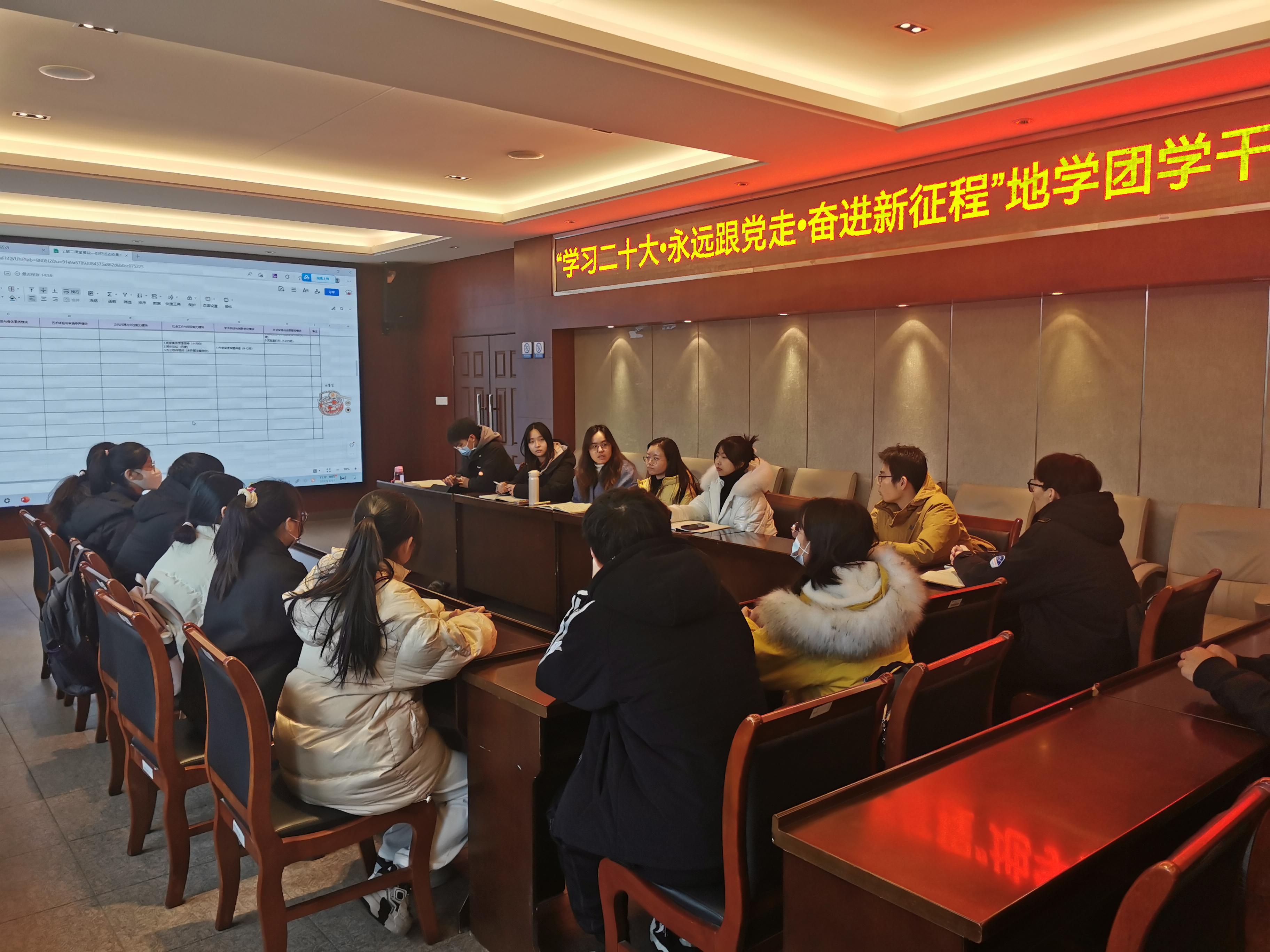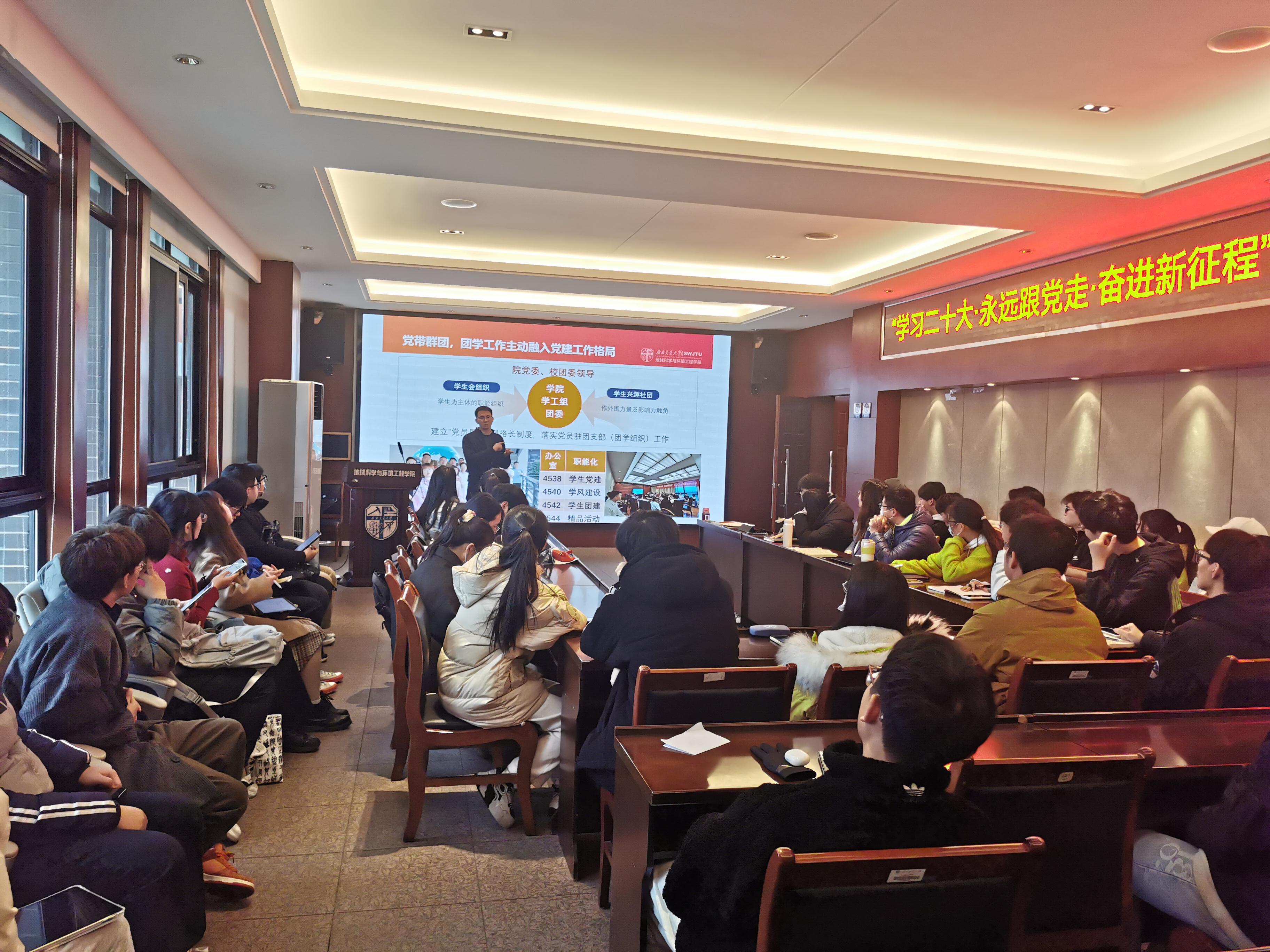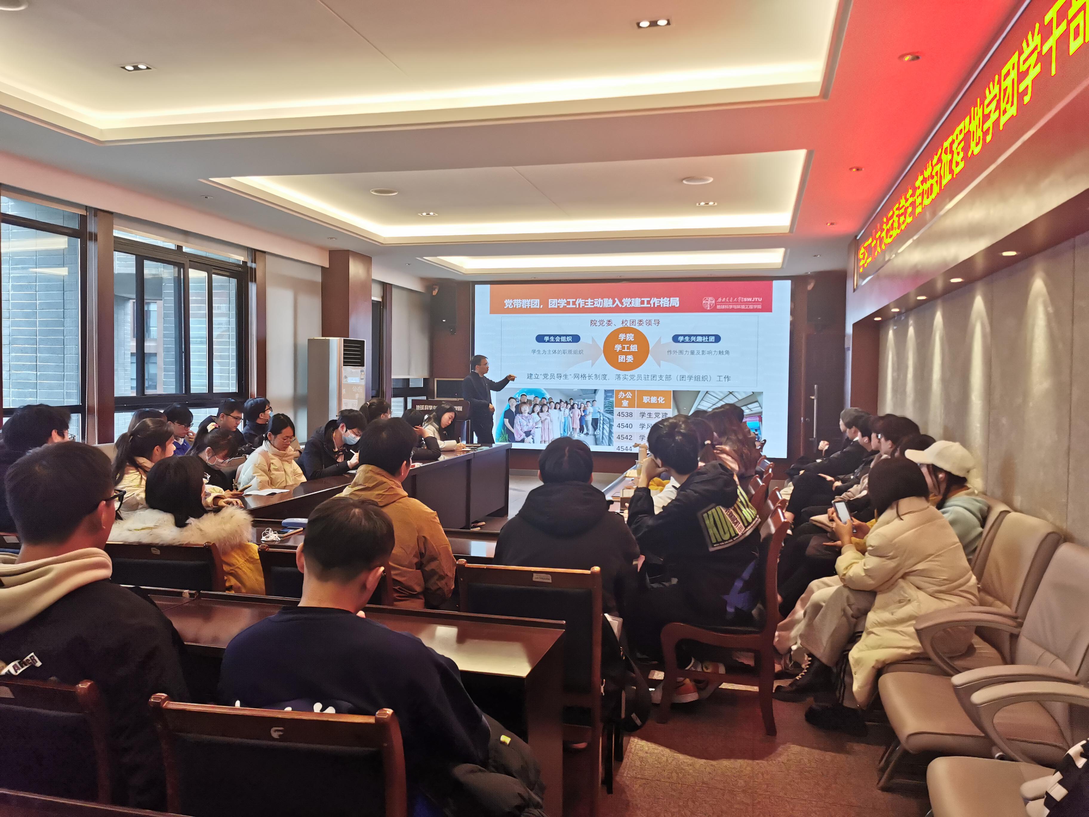 为增强学院学生会工作人员对学院团委工作架构的理解,进一步提升学生干部工作能力和学生会各部门之间凝聚力,地球科学与环境工程学院学生会于12月1日下午15:40于X4520会议室召开2022年度第二次培训大会。本次会议由学生会主席胡佳慧同学主持,学院团委书记杨都强主讲,学院团委副书记李婧、综合素质提升中心指导老师陈荩娜出席,学生会全体工作人员到场听会。