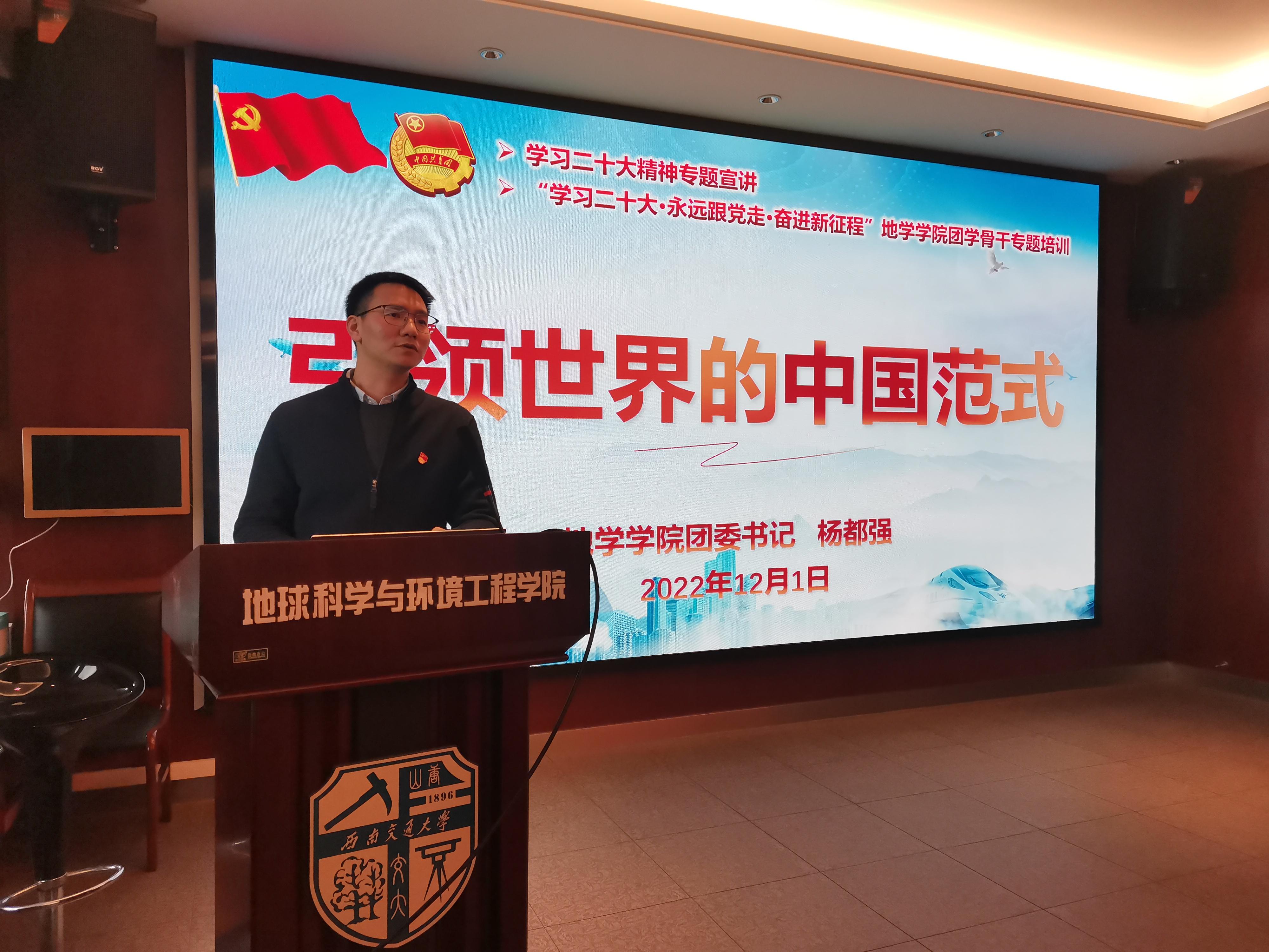 会议最初,杨都强老师就学生干部深入学习贯彻党的二十大精神做了明确要求,鼓励同学们先通过读原文等形式产生自己对党的二十大报告的理解,再到各个班级团支部之间开展学习宣讲活动。杨都强老师对党的二十大精神的重要内涵进行了宣讲,通过援引邓小平同志答记者问等例子,从多个层次对中国式现代化的五个特征进行解读,强调中国式现代化符合中国的国情特色。他号召同学们坚守奋斗精神,在深入领会二十大精神并向身边同学积极传播的同时,一定要注重把精神学习与自己的成长实际相结合,做到勤勉刻苦、准确把握、求真务实,展现学生干部青春本色。
