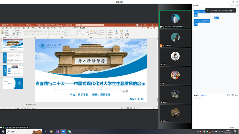 研2021级测绘第三团支部以线上学习的方式开展了本次主题班会,以继续学习二十大内容思想为基础,通过班级同学以及师兄师姐相互致辞、交流的方式开展。深入地阐述了中国式现代化的科学内涵、中国特色、本质要求和重大原则,并发表主题演讲将中国式现代化特点与当代年轻人的责任结合展开讨论,探讨如何拓展眼界和知识范围为祖国的现代化建设添砖添瓦。