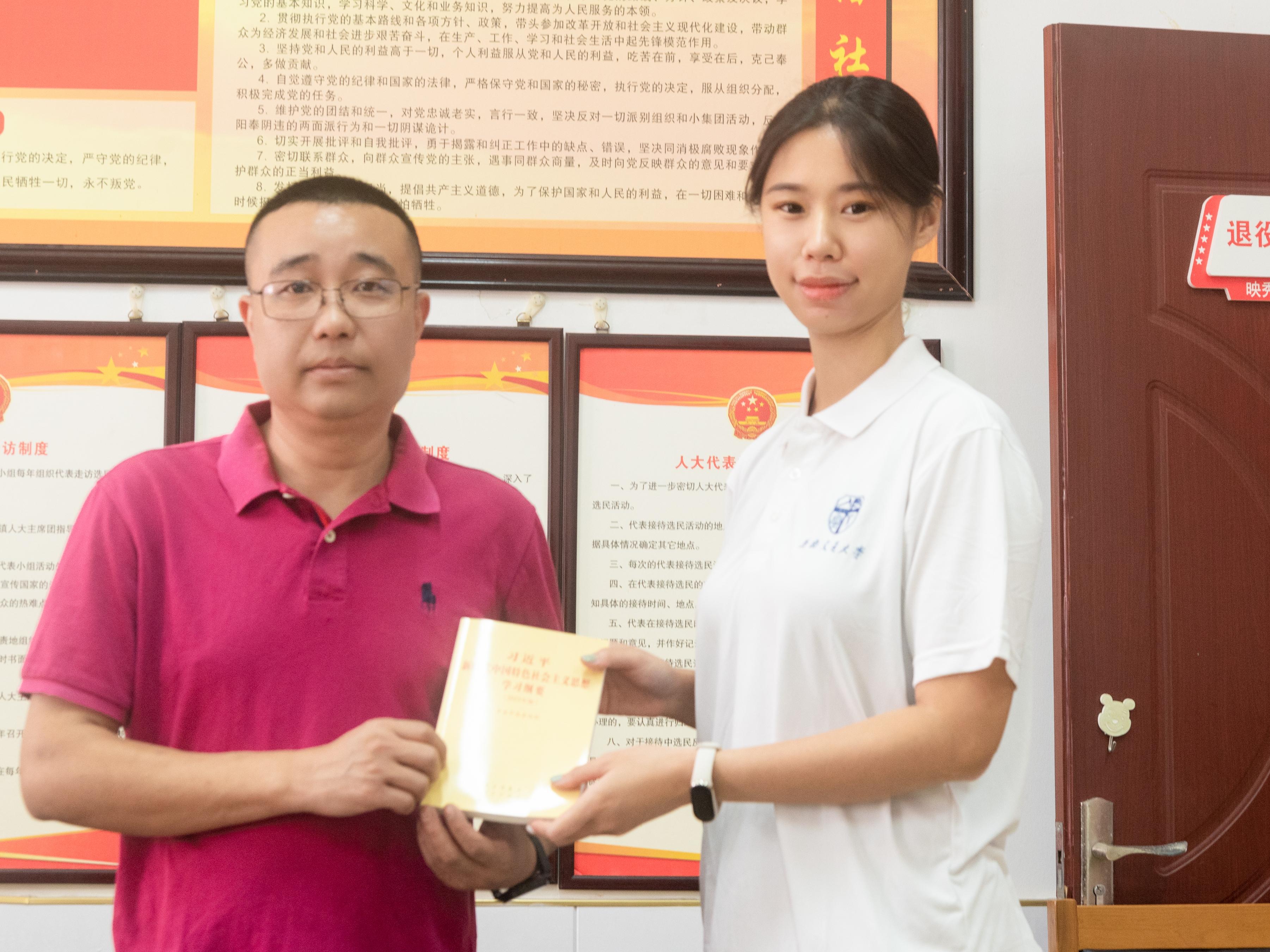8月13日上午,团队抵达映秀镇秀坪社区。在社区的协助下,团队展开了赠书仪式。作为“铸牢中华民族共同体意识”的宣传起点,团队向秀坪社区赠送了包括《习近平新时代中国特色社会主义思想学习纲要》、《非彼无我 美美与共:中华民族的交融与共同体意识》、《铸牢中华民族共同体意识下西部地区地方政府能力建设》、《毛泽东选集》在内二十余本书籍,旨在引导更多人深刻理解有关民族工作的思想,培养共同体意识。秀坪社区副主任邹强代表社区接收赠书,并表示书籍非常有意义,十分感谢每日大赛