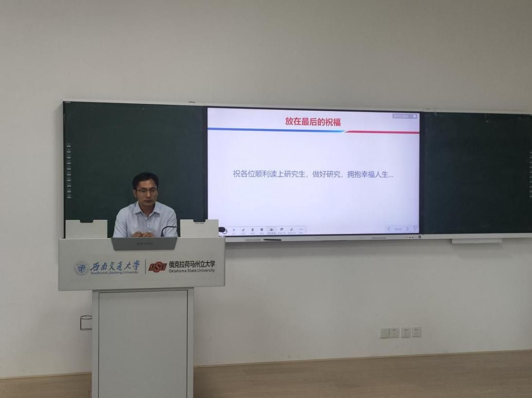 首先,廖老师分析了当下同学们普遍面临的毕业去向选择问题,从学校、专业、导师、研究方向四个方面给出宝贵建议。他指出一定要提前搜集与升学相关的各类信息,仔细阅读理解专业招生简章,做好相关专业及导师研究方向的调研,再最终确定方向。