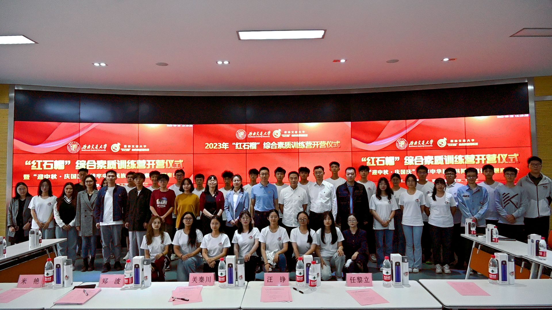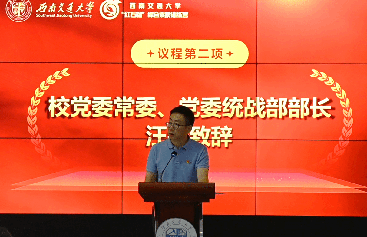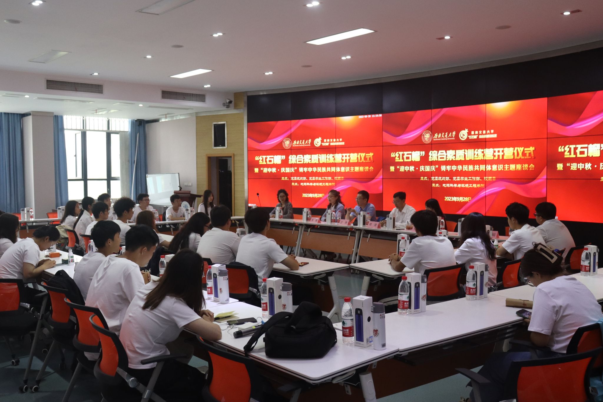 在犀浦校区举办“红石榴”综合素质训练营开营仪式暨“迎中秋·庆国庆”铸牢中华民族共同体意识主题座谈会。学校党委常委、党委统战部部长汪铮,地球科学与环境工程学院党委书记关秦川和校团委、党委学生工作部等相关领导,以及训练营营员、来自15个民族大一新生们参加活动。该活动是学校铸牢中华民族共同体意识精品项目之一。