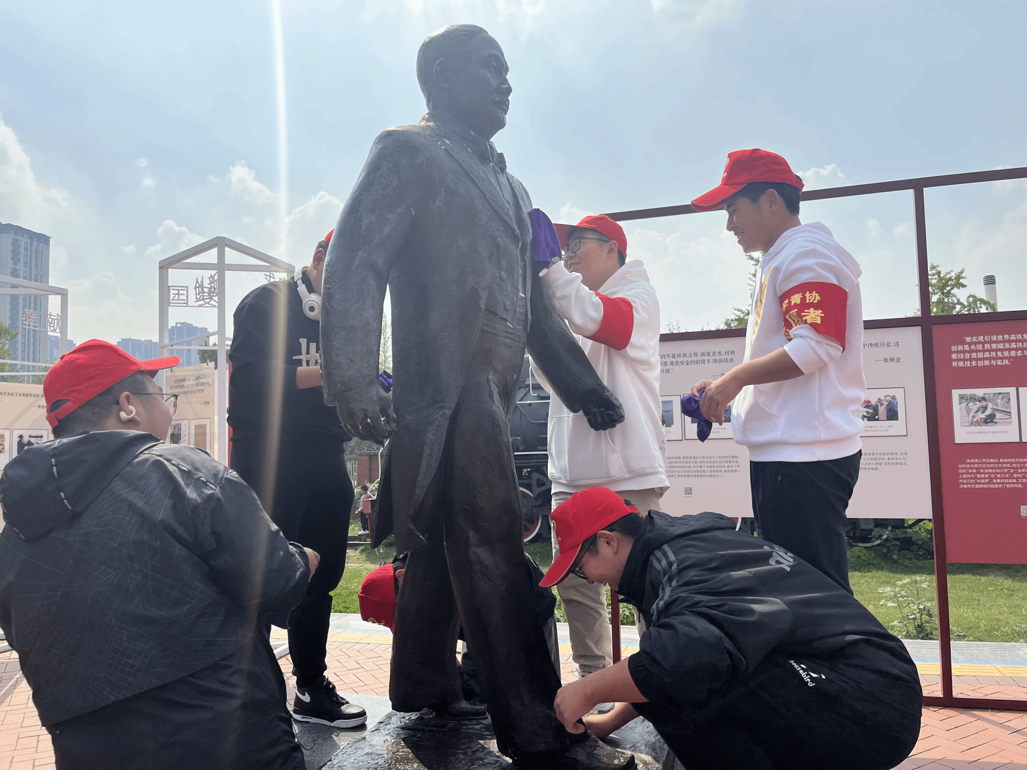 活动当天,志愿者们早早集结在詹天佑雕像的周围,准备清理工具和清洗物品。大家头戴统一的志愿者帽子,手持清洗工具,踏上了这场高尚而艰巨的任务。