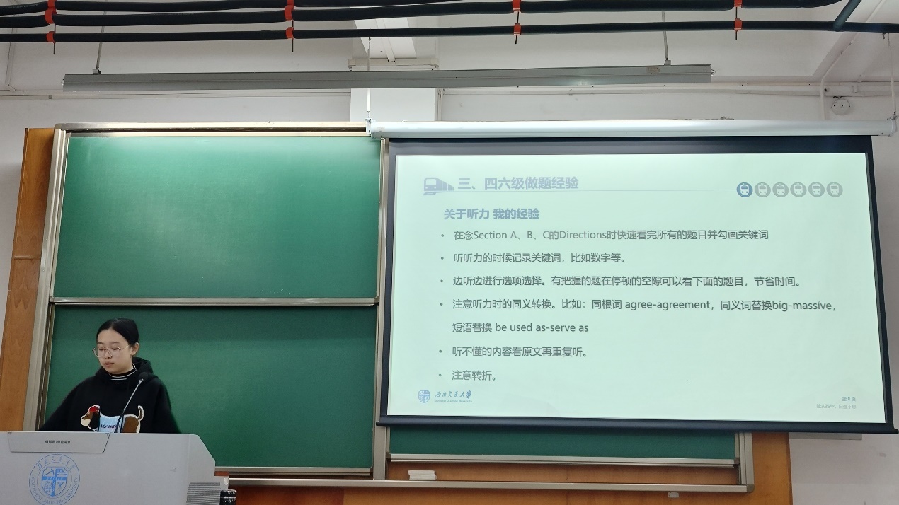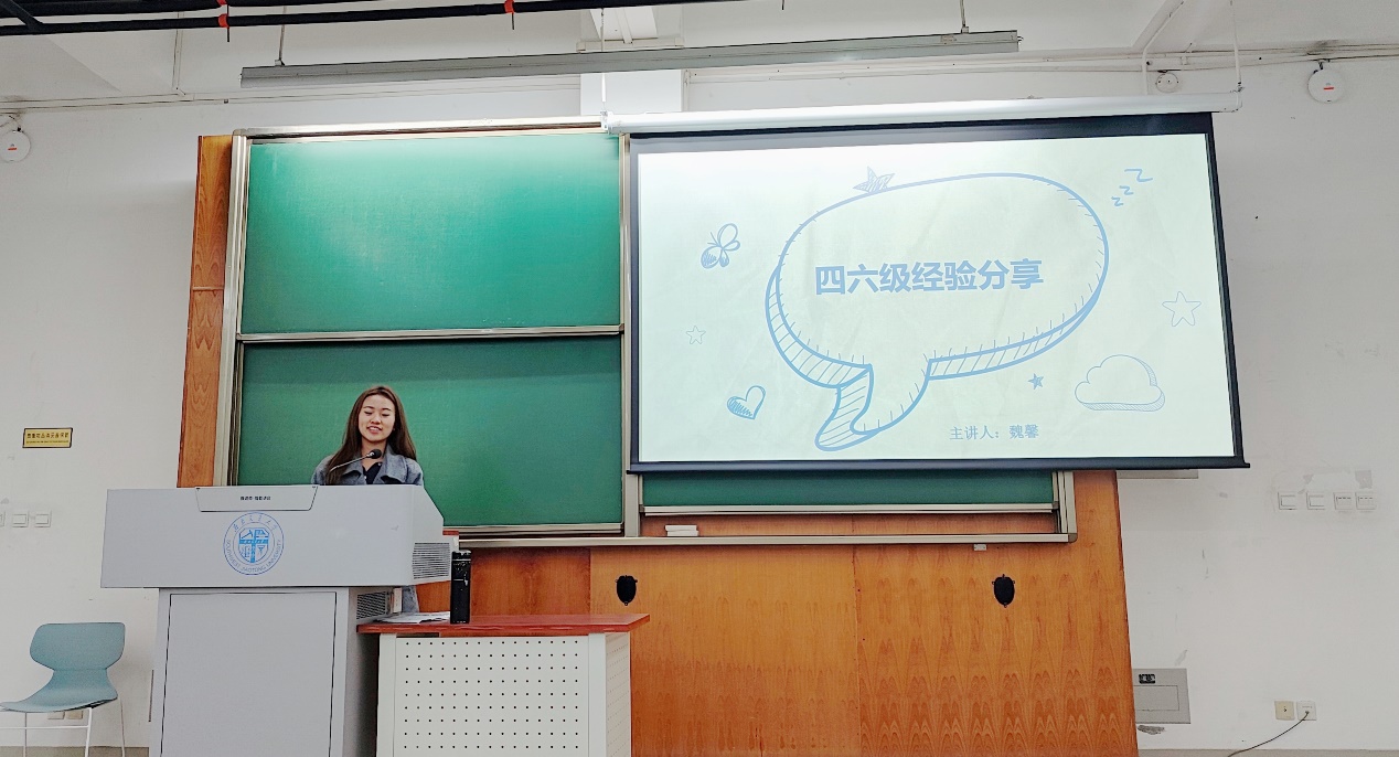 接着发言的是魏馨同学,对于四、六级考试,她认为需要从听力、阅读、写作和翻译方面来进行训练。关于听力,则需要多练多记,养成认真阅读题干的习惯,做到“听、勾、记、查”;对于阅读理解,则需要养成勾画关键词的习惯,有助于快速找到文中相对应的内容。考试时,还应该注重时间分配,以保证能够在规定时间内顺利答完试题。