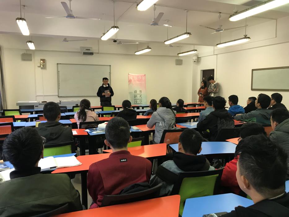 在活动中,同学们热情参与积极配合。第一位进行分享的是黎和子阳同学,他介绍了诗人北岛、海子,以及《美丽新世界》一书,并阐述了他的阅读感悟和自身的阅读习惯,发言内容丰富且有内涵。
