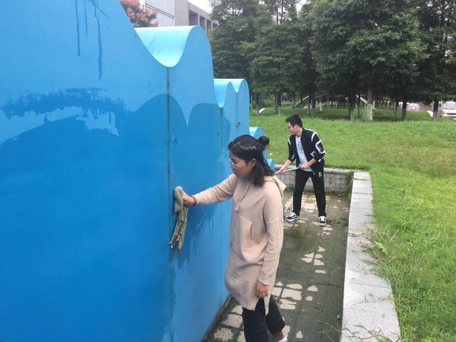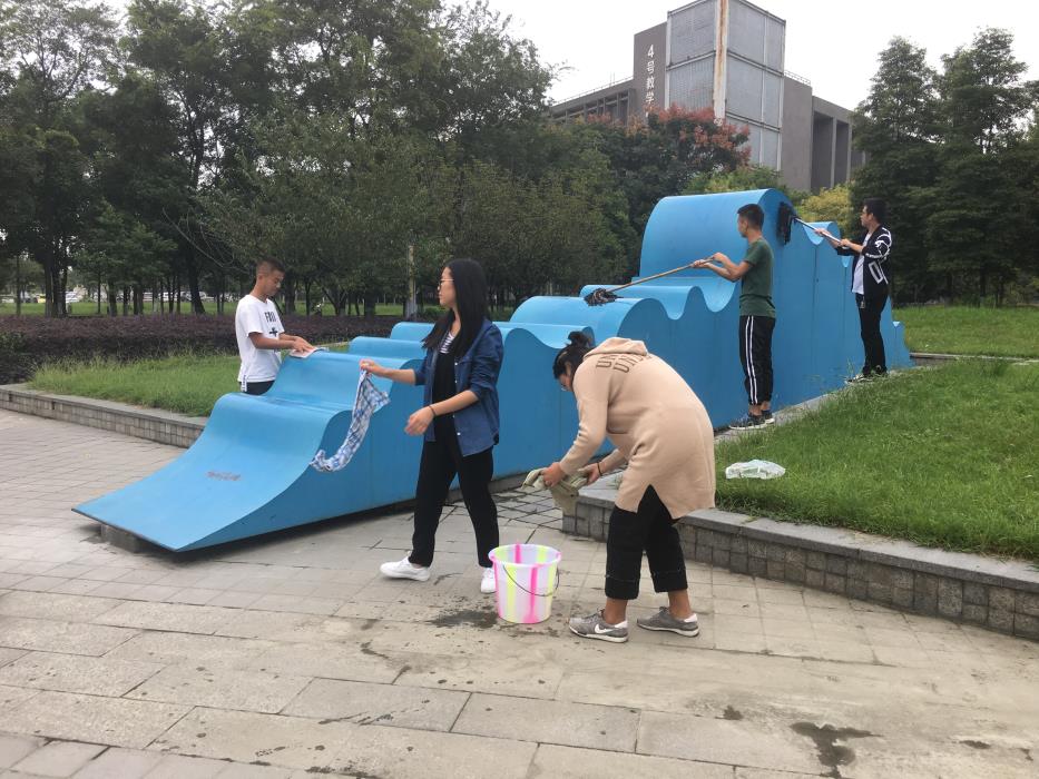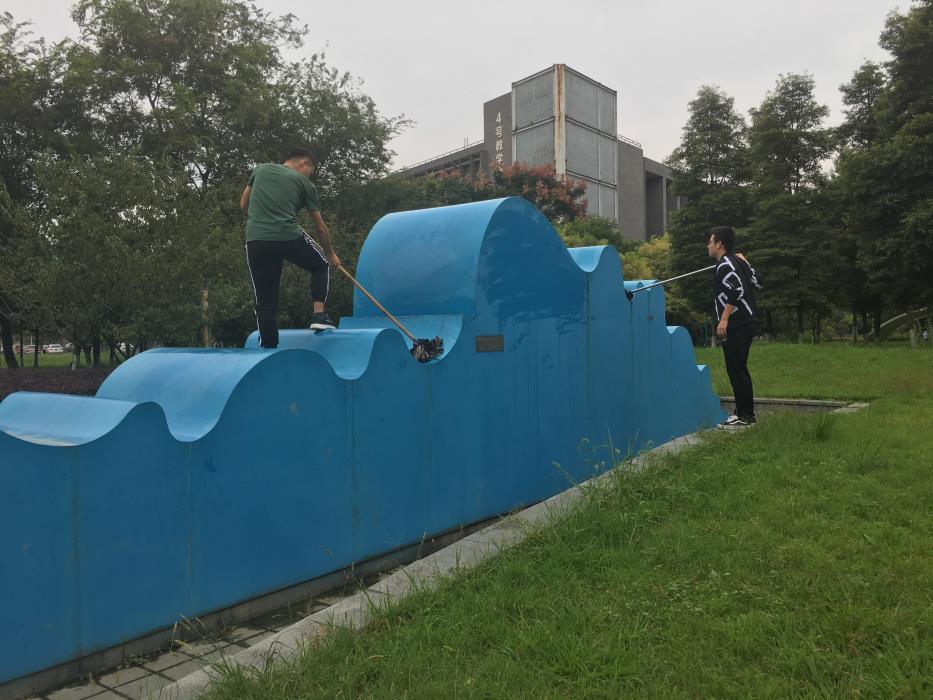 为了清洁和维护学校雕塑,给同学们一个舒适干净的校园环境空间,9月13日,我们的志愿者们展开了对图书馆正门前的蓝色大波浪的清洗活动。