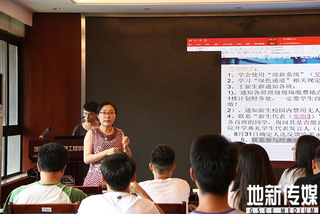 8月29日下午,地球科学与环境工程学院2017级迎新培训会于X4520举行。迎新培训会由姜永杰老师主讲,王静雅老师出席本次会议,全体代理班长班、学生会、青协、传媒,党员服务队主席团成员以及2016级各班志愿者班委参加本次会议。