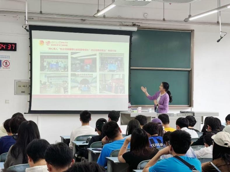 团课伊始,韩沁儒老师以“硬联通、软联通、心相通”为主线,系统梳理了学院在实践育人方面的丰硕成果。在“硬联通”方面,聚焦川藏铁路博士建设服务团:五年间,团队暑期扎根沿线工程段,开展地质勘察与技术调研,以实际行动服务国家重大工程,彰显“交通强国”使命担当。“软联通”部分,韩老师分享了“红石榴训练营”通过文化沙龙和专题研学强化中华民族共同体意识的经验,并展示了优秀校友访谈成果,为同学们的成长路径提供有益参考。“心相通”环节,则通过介绍团学组织深入社区开展课业辅导、走进乡村助力农业发展的志愿服务案例,呈现青年学子与社会的深度融合,树立了社会化能力培养的生动典范。