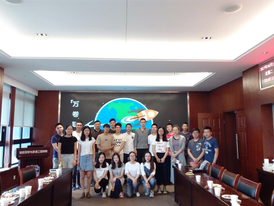 地球与环境科学学院研究生会会长王国元,主持人谢玮以及地球科学与环境工程学院研究生会全体成员。