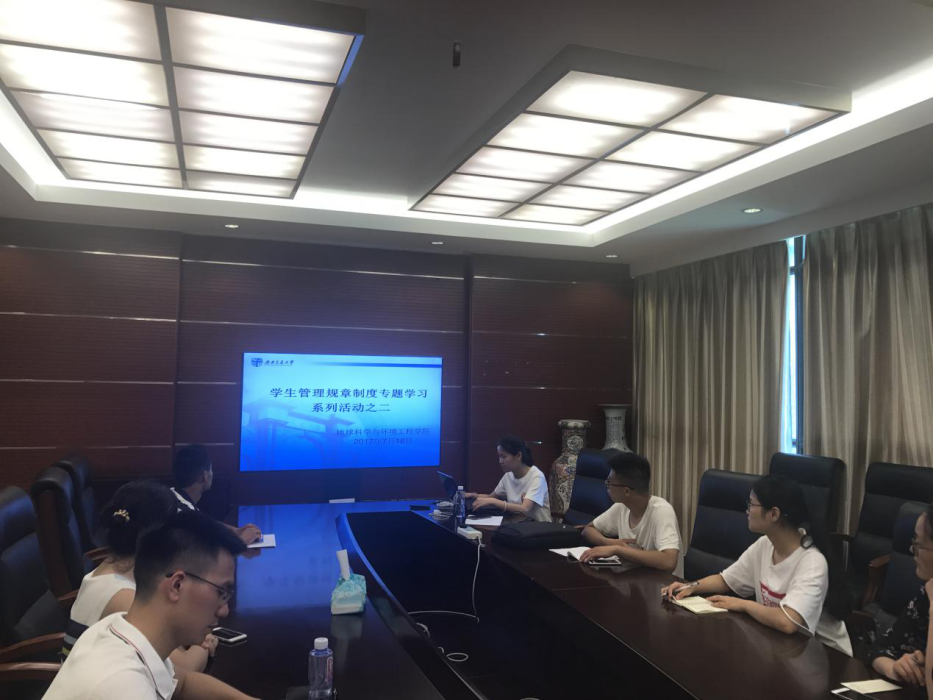 2017年7月18日下午,地球科学与环境工程学院学生工作组在学院4531会议室开展第二次学生管理规章制度专题学习系列活动,每日大赛