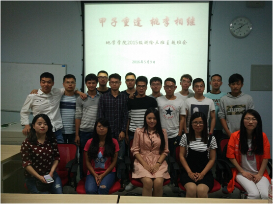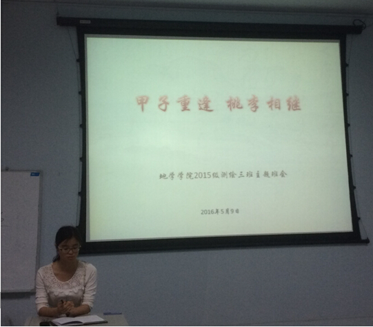 2016年5月9日星期一晚七时,地球科学与环境工程学院2015级硕士测绘工程三班举办的“甲子重逢,桃李相继”主题班会在犀浦X9135教室顺利举行。本次活动由班长谭倩兰主持,测绘三班全体人员参加。