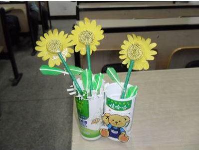 在班会前,每个小组收集利用自己身边的废品,先想好设计的理念,,然后利用这些废品,设计出了环保产品。所以接下来就由主持人有请每个寝室的代表先展示自己的创新产品,然后向同学老师阐述自己的设计理念,环保之处。