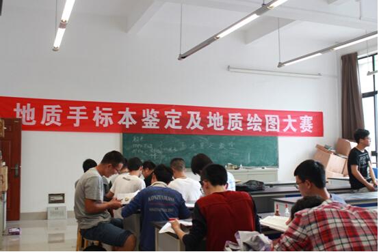 正式比赛开始以后,在地质手标本鉴定比赛现场,同学们充分利用放大镜和试剂等现有工具合理分工来鉴别每块岩石的名称。而在地质制图比赛现场,同学们的团结意识进一步体现出来,比赛刚刚开始,小组成员之间就开始认真的讨论,气氛热烈。在比赛过程中,老师们一边观察同学们比赛的情况,一边还对同学们没有学习到的知识细心讲解。