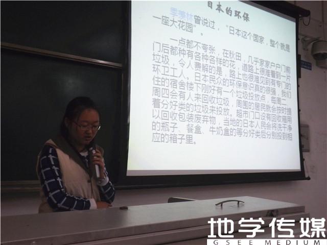 首先上台分享经验的是汪彩琴同学。汪彩琴参加了2014年秋田县立大学暑假交流项目,并获得了校长全额奖学金。她首先简单介绍了秋田县立大学的历史与发展、学校环境以及在此学习生活的情况,重点提到了秋田县立大学浓烈的学习氛围和高端完善的实验技术。对于日本和日本人,汪彩琴感叹道,此次交流改变了她对日本民众的看法,让她深深感受到了日本普通民众的朴实、友善与真诚。最后,汪彩琴对留学日本相关事宜给出了一些参考和建议,内容涉及语言条件、生活费用、日语水平、家庭经济、思想准备等。她告诉同学们,出国留学需趁早准备。