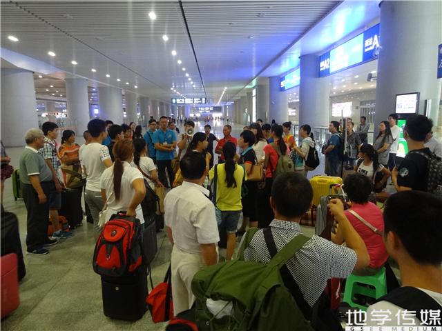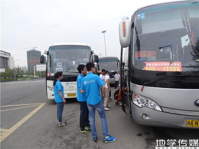 确保每一班火车的新生及家长都到出口后,工作人员便带领他们到集合点休息,由何杨老师对校车的接送情况做一个简单的介绍和安排。接着工作人员便带领着他们乘坐校车来学校报道。