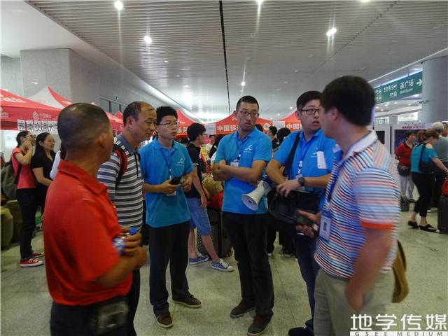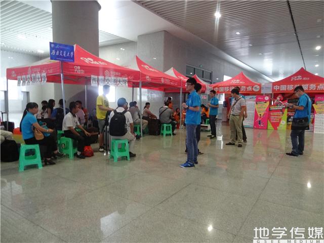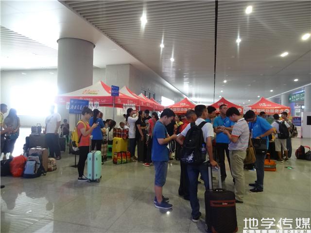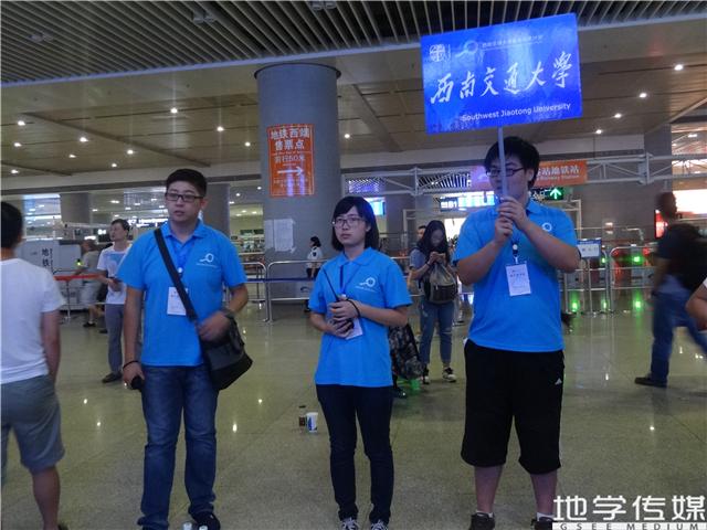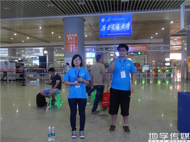 到达东客站以后,由于火车东站的特殊性和先进性,我们的迎新点布置在站内。所有的志愿者统一着蓝色服装,佩戴白色工作证,在出站口高举着印有“每日大赛