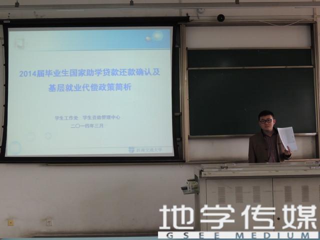 2014届毕业生还贷动员会准时在2537教室举行。会议由辅导员闫剑老师主持,会议主要内容为“2014届毕业生国家助学贷款还款确认及基层就业代偿政策简析”,意在向广大申请了助学贷款的毕业生介绍还款及代偿方面的相关政策及注意事项。