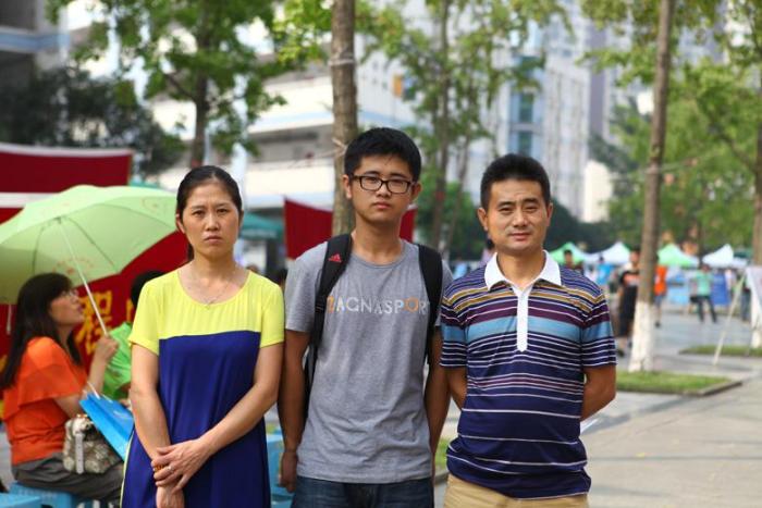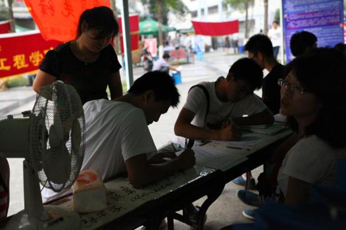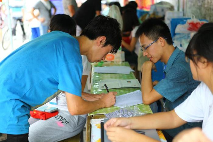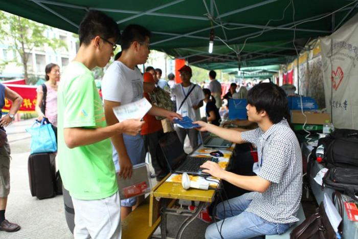 工作人员为新生扫面录取通知书