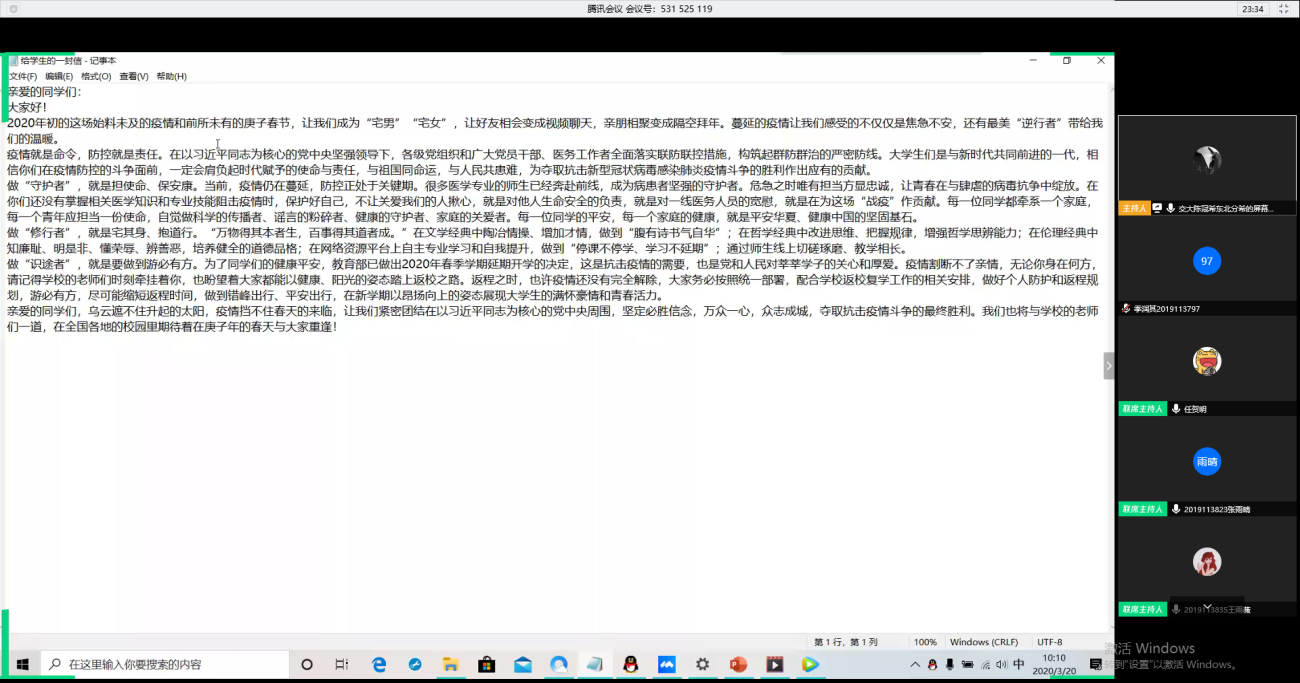 最后以学校的一封信结尾,让大家再次感受到了学校对自己的关心与照顾,大家也迫切希望着能尽快回到学校的怀抱之中,以及对世界摆脱疫情的祝福。