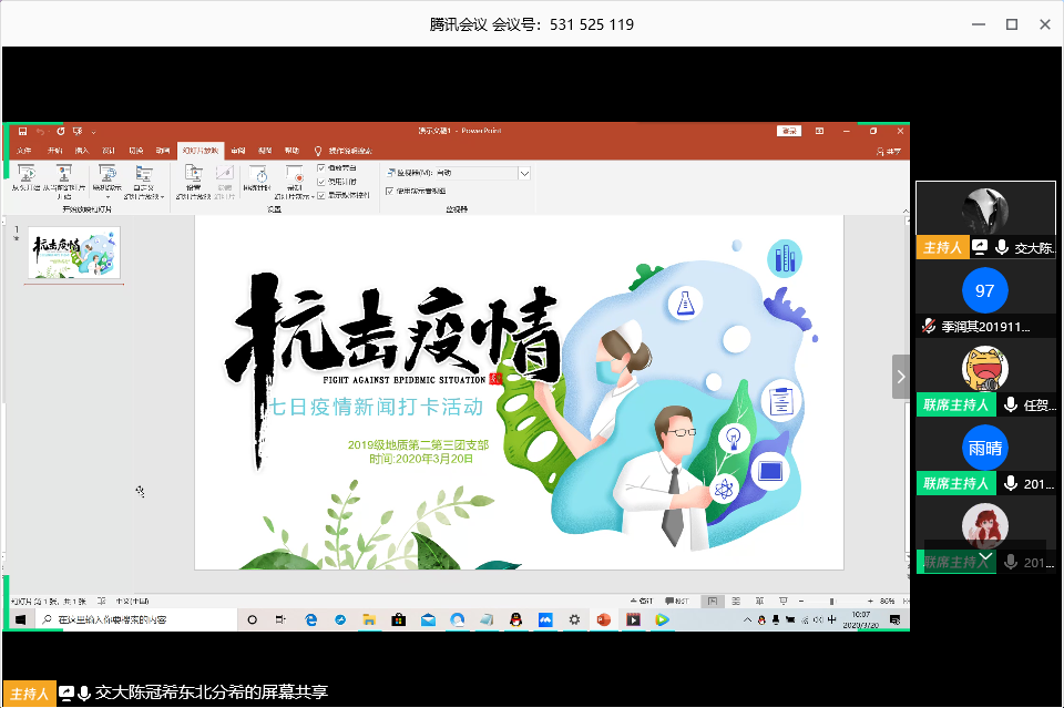三月二十日早晨,地院地质二三班,用腾讯会议在线开展了“疫情防控七日疫情新闻打卡”主题党日活动,全体人员进一步了解疫情的现状,讨论研究当今现状发表自己的感想。