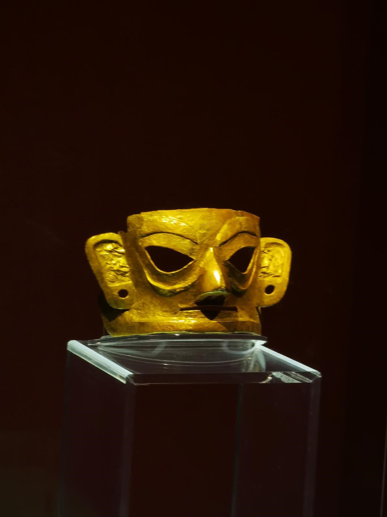 还有金面具五官分明,基本能够再现人的面部特征,并且在眼睛耳朵等地方有更加细节的刻画,使面具更加生动形象,体现了古人冶金工艺的细致。