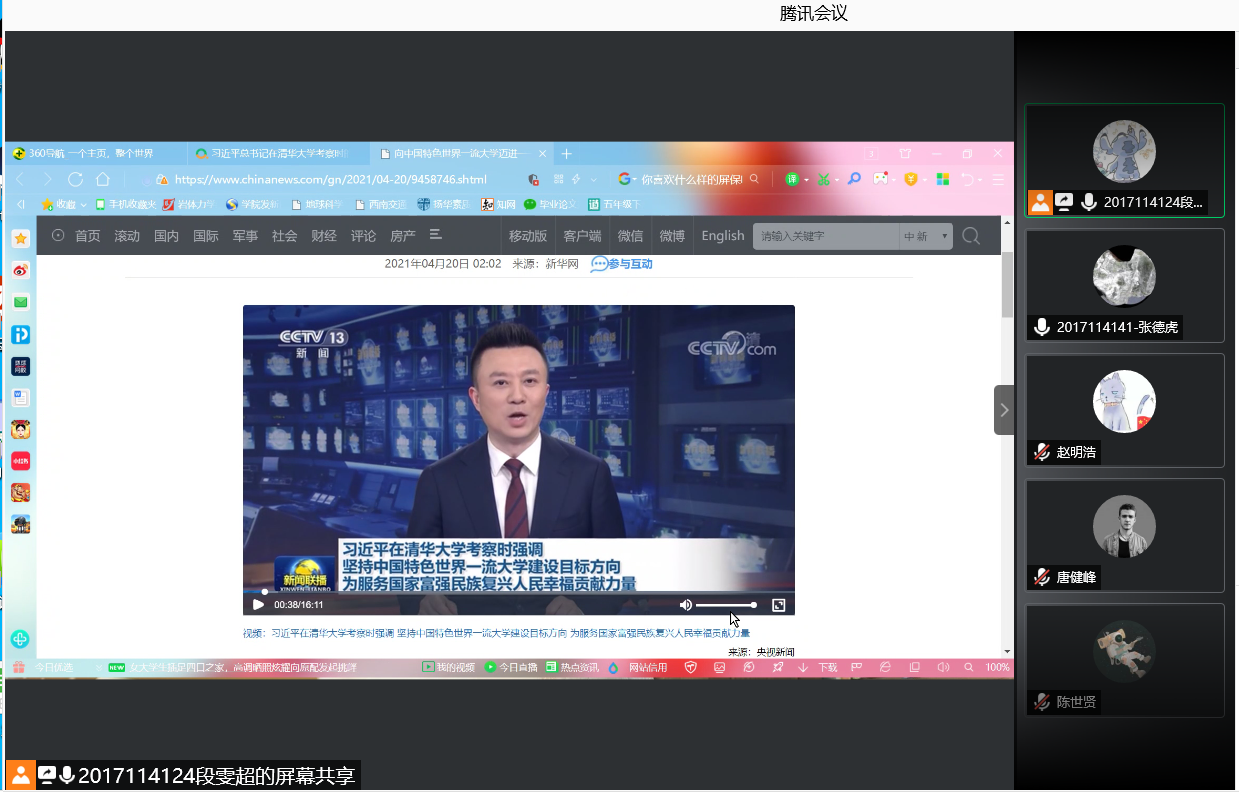 第二项,段雯超同志带领大家学习习近平总书记在清华大学考察时的重要讲话。同学们一致认为,习近平总书记的重要讲话对新时代中国青年寄予殷切期望、提出明确要求,令人倍感温暖、倍受振奋。习近平总书记对青年一代提出的爱国爱民、锤炼品德、勇于创新、实学实干的重要要求,站位高、立意远,具有很强的针对性、指导性,为青年一代成长发展指引了正确航向,为新时代共青团和青年工作提供了根本遵循。我们要把习近平总书记的重要要求内化于心、外化于行,认真履职尽责、不懈拼搏奋斗,以实际行动回报习近平总书记和党中央的关怀与信任。