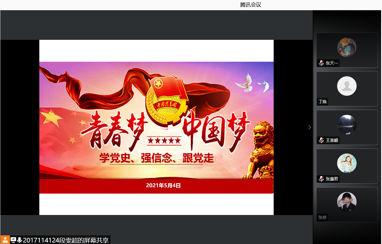 54日下午,2017级地质第一团支部在腾讯会议开展团日活动,活动主题为“学党史、强信念、跟党走”,本次活动主持人为团支部书记段雯超。