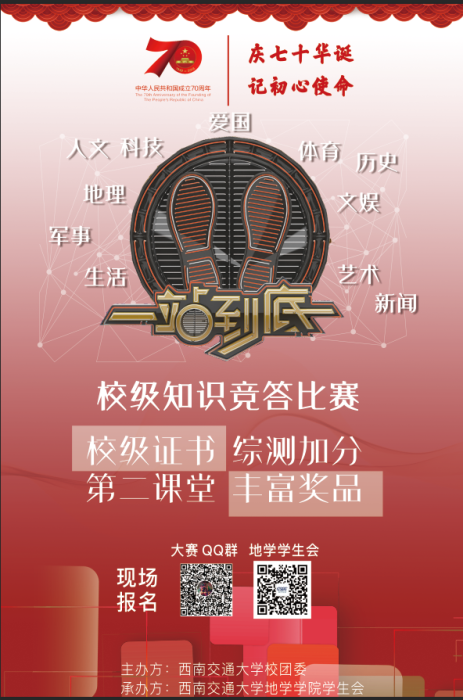 地球科学与环境工程学院学生会承办的第六届“庆七十华诞,记初心使命”新生文化节——“一站到底”知识赛正式开始报名。此次比赛面向全体本科生,旨在引导大学生更好的继承和发扬爱国主义精神,继承和弘扬先辈建树的优良传统的同时丰富同学们的校园生活,激励同学们学习知识提升自己,提高大学生的综合素质和核心竞争力。