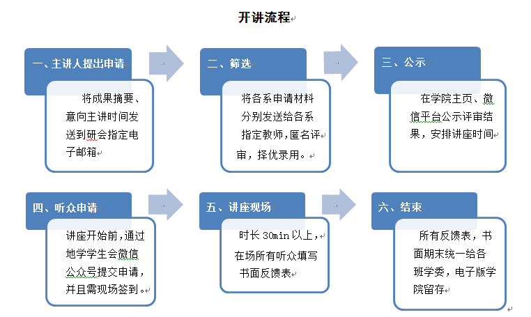 2.地学研究生会将根据报名人数以及主讲人申请的意向主讲时间,对出场顺序进行相应调整,并于开讲前2周进行通知。