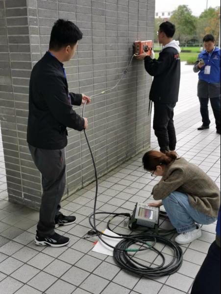 11月21日15时,各参赛队于四教天井进行竞赛B方案的决赛,对四教的承重柱的质量进行无损检测。11月22日17时,各参赛队伍就自己设计的思路以及考虑到的问题设备的参数测量的图像进行讲解和说明。地质工程系张志厚老师、雷治红老师、马宁老师对比赛项目进行评分,并针对各参赛队伍的表现情况进行点评。