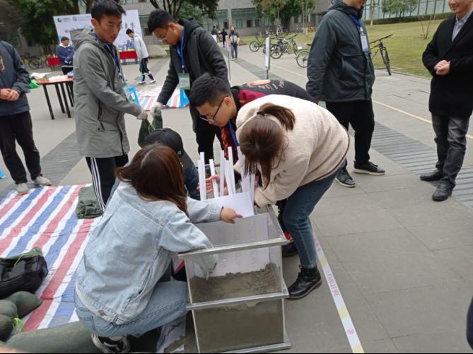 11月22日13时,参赛队伍在四教天井开展决赛A方案决赛,进行支挡结构建造。六支队伍各显神通,集中精力认真比赛,比赛于17时正式结束。比赛由成都四海岩土工程有限公司廖必成、朱维新进行裁判,我校土木工程学院罗强教授、毛坚强教授进行审核。