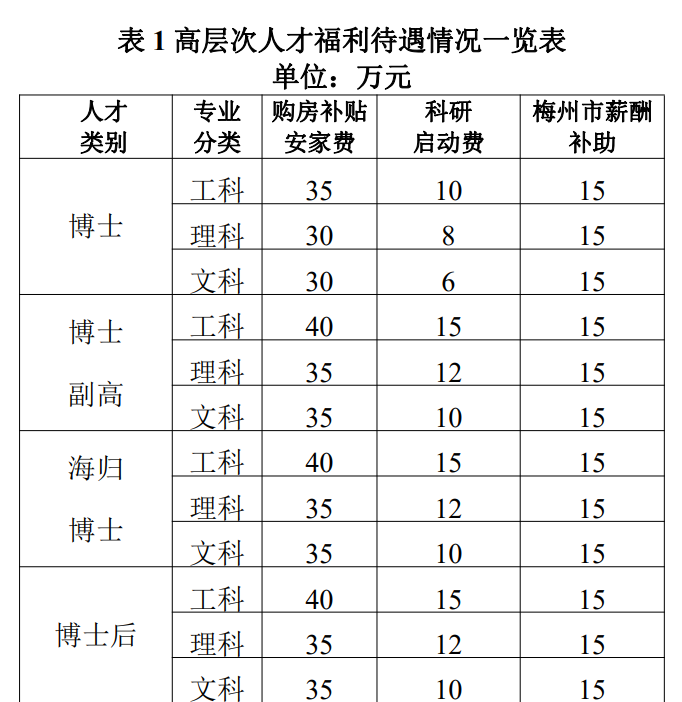 5)福利待遇见表 1,高层次人才福利待遇情况一览表。