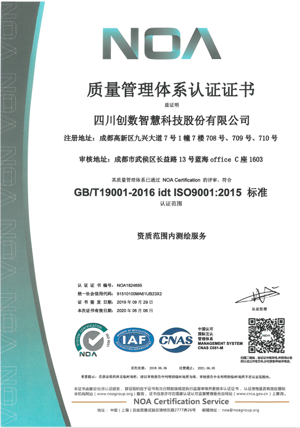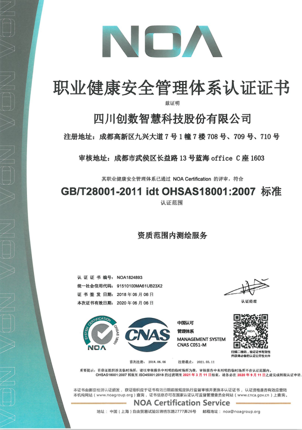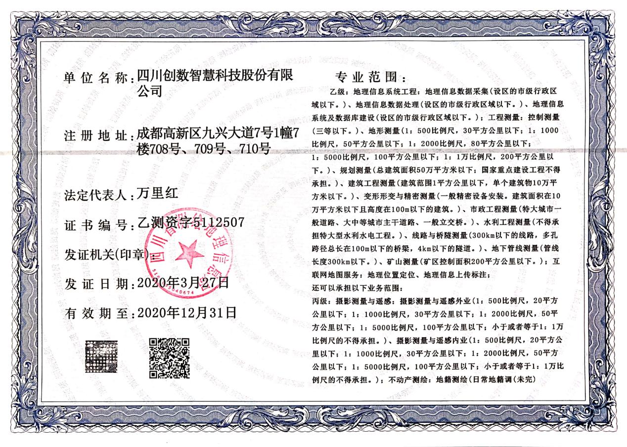 公司拥有地理信息数据采集、地理信息数据处理、地理信息系统及数据库建设、互联⽹地图服务、地理位置定位、地理信息上传标注等⼄级测绘资质,通过了ISO9001:2015质量管理体系认证、ISO14001:2015环境管理体系认证、OHSAO18001:2007职业健康安全管理体系认证,并且有国家版权局下发的多件计算机软件著作权等级证书,如创数两区划定电⼦政务建库与管理平台证书等。