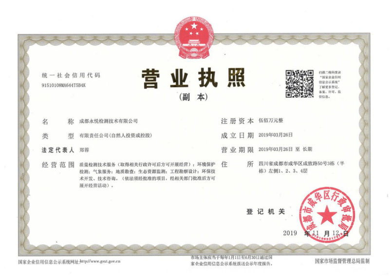 成都永悦检测技术有限公司(Chengdu yongyue testing technology co. LTD),位于成都市成华区成致路50号3栋,成立于2019年3月,经成都市成华区市场和质量监督管理局依法注册成立主要从事环境监测、工程质量等检验检测技术服务工作。