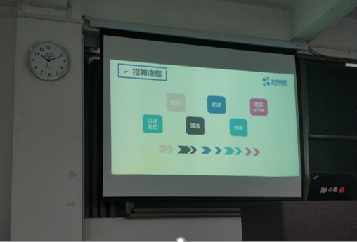 首先武汉中地数码科技有限公司的HR胡晓岑经理,给到场的同学介绍了公司的基本情况,并放了宣传片,让大家进一步了解了公司的基本情况,同学们认真聆听并做好相应记录。随着宣传片播放完毕,宣讲会正式开始。胡经理主要从行业情况、行业地位、员工发展情况及员工待遇、招聘岗位及基本招聘流程五个方面跟大家介绍公司的优势与基本情况,给大家提供参考与帮助。