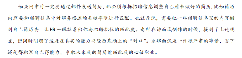 第一阶段,是关于简历部分的指导。老师提出了两个问题,即“般来说,HR排除掉一份简历的时间大约是多久”,“HR由你的简历决定是否让你来参加面试的时间一般为?”。答案是7秒和15秒。由简历筛选的残酷,老师提出了一个重要观点,HR是招最合适公司对应职位最合适的人的,首先简历必须合乎规范,职业化,符合招聘标准;再者,简历的目的,是让面试官在25秒之内,想要见你一面,好的简历需要HR认定你就是为相应岗位而生。