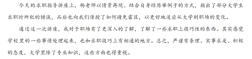 讲座过程中,老师结合自身经历对同学们进行了求职指导,同时还向大家介绍了STAR原则,即S—Situation情境;T—Target目标/Task;A—Action行动;R—Result结果。求职时可以依据这项原则进行思考准备,生活中也可以运用这套原则,可以很好地锻炼我们做事的逻辑思维能力。