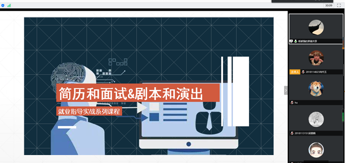 在会议开始时,杨老师对以往学院及个人经历的就业指导活动进行了总结介绍,并提出本次讲座的主要概念“简历和面试&剧本和演出”。即将简历和面试作为一场剧本和演出对待,从而引出了相关实践技巧。