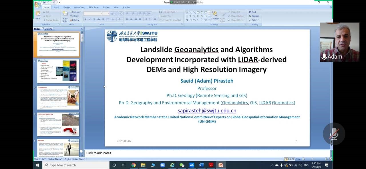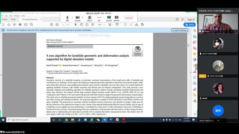 2020年5月7日晚20:00,地球科学与环境工程学院邀请学院外籍教师开展“国际化+名师讲堂”国际视野与出国留学系列第三期讲座,本次讲座通过线上平台“腾讯会议”进行,主讲人为Saeid(Adam) Pirasteh教授,讲座由杨都强老师主持,讲座主题为Research Colloquium in Geospatial Information Management for Disaster Management: Landslide(地理空间信息管理促进灾害管理研究讨论会:滑坡)。