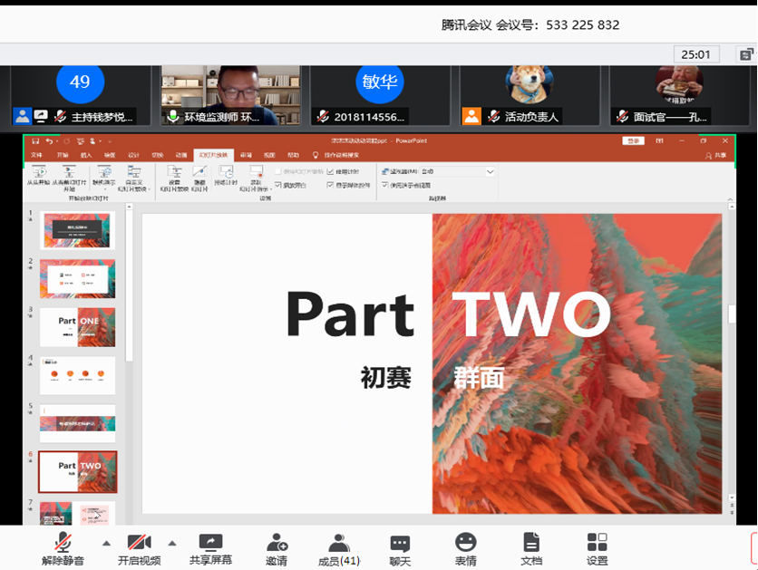 2020年5月8日晚19:30,“模拟线上招聘会”求职大赛迎来最后的重要环节—“模拟面试比赛”,本次比赛通过线上平台“腾讯会议”进行,比赛由钱梦悦、王媛等同学主持,每日大赛