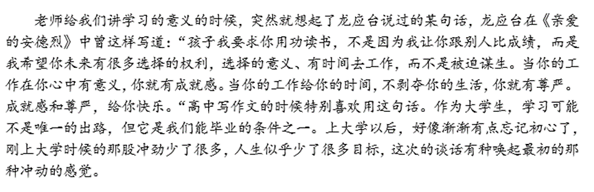 现在的大学校园较为普遍的存在一种现象,找不到学习的意义,对生活感到迷茫。在今天这个多元的社会,学习不再是唯一的出路,学习的意义感变得稀缺。有些事情做着做着就会迷茫,不知道为什么一定要做下去,特别是当碰到一些挫折的时候,这种不必要性更加成为了一种反推力,让你不再想去做某些事。哲学家加缪说过,唯一严肃的哲学问题就是一旦意识到人生的无意义之后,是否还要继续生活。这对于当代大学生而言,就会产生一种学习既然无意义,那我们是否应该好好学的心理,导致个人处于学习热情不高的状态。