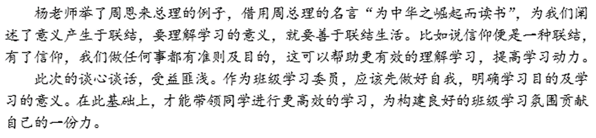联结的关键在于认识到意义的构建是一种互动交流的过程。从个人的角度思考,要立足当下,积极的去与学习和班级建立联结;从班级的角度去思考,就是需要班级积极的去与每个人建立联结,我们常说的集体荣誉感,对班级的归属感就属于此范畴。营造班级的学习氛围首要的就是让班级的每个个体与班级建立联结并维持这个联结,这样有利于班级中个人学习的一方面的意义的形成,使得个人更加有热情去学习,班级中每个个体的学习状态提升了,班级的学习氛围自然就会变好。