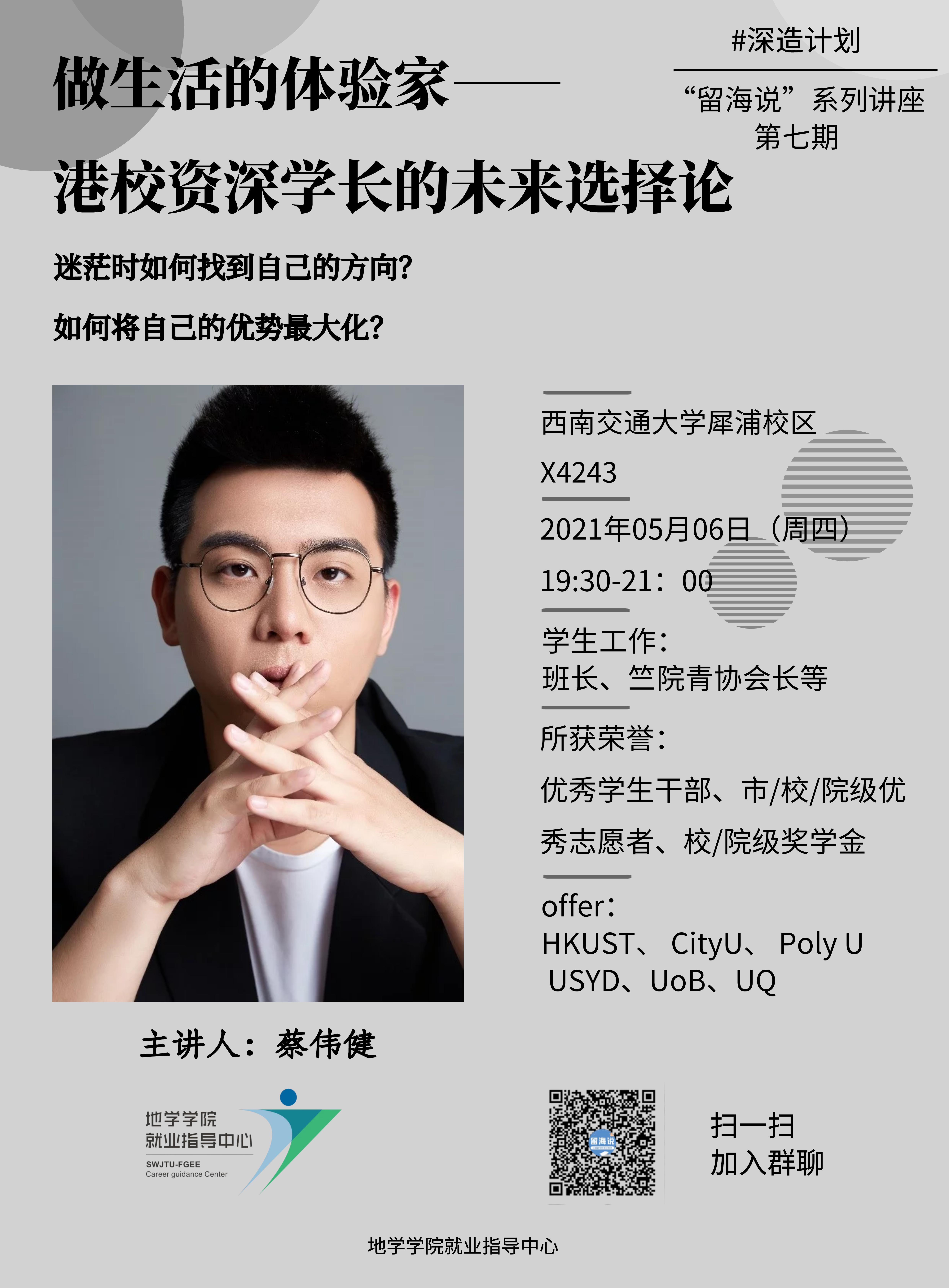 此次活动旨在为有相关留学意愿和需求的本科生与有经验的优秀学生提供交流的平台,分享留学的知识和经验。同时,以他们的亲身经历和丰富的经验给还在彷徨的同学答疑解惑,加深对留学的了解和认知。提高学生国际视野,明确未来的深造规划。欢迎大家踊跃报名参加!现将第七期讲座信息发布如下: