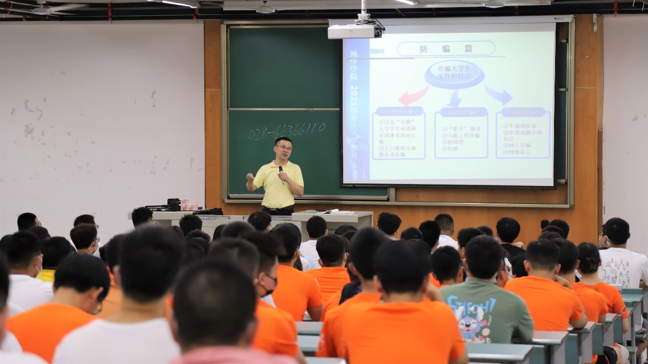 傅尤刚在安全知识教育开始前与2021级新生进行了亲切地交流,嘱咐同学们疫情期间做好个人防护。随后进入主题,他表示,在入学之初开展安全教育,是社会发展、社会法制建设和经济发展的需要,也是大学环境的客观要求。他结合数据和案例重点讲解了防盗、防骗、防人身伤害、交通安全、防火以及防震六个方面的安全知识,叮嘱同学们要提高安全意识,掌握一定的安全知识,尤其是要警惕网络上出现的各种新型骗局,保护好自己的人身财产安全,同时也要遵纪守法,严以修身,共同创建和谐校园。