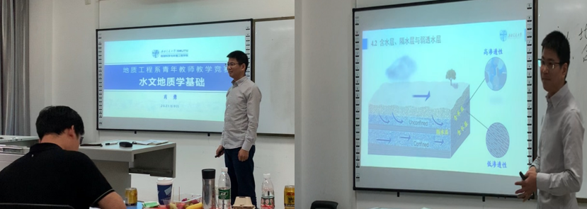 肖勇老师主讲《水文地质学基础》,他选取《水文地质学基础》课程“第4章 地下水的赋存”作为教学竞赛内容,在学情分析的基础上,首先回顾了前述章节学习内容,然后结合川藏铁路水文地质挑战导入本讲学习内容并强调了其重要性。课程讲授重点突出、声情并茂、清晰明了、效果优良。评委老师评价到肖勇老师教学内容准备充分,课程内容融合了国内外优秀教材和最新文献,课件制作精美,并结合国家重大工程实践,引导学生理论联系实际,可较好地吸引学生的专业兴趣,同时也给出了板书及理论联系实际方面的一些提升建议。