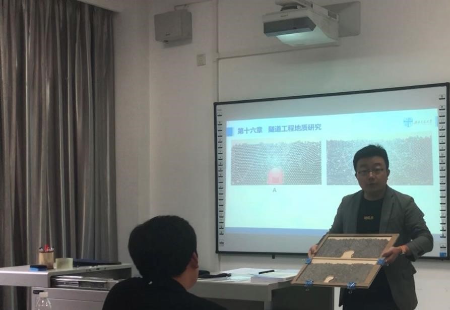 杨虎锋老师主讲《工程地质学》,他采用自己制作的隧道工程地质模型教具演示导入讲课内容“隧道围岩分级”,通过案例教学法进行授课,评委老师评价教学过程安排合理,方法运用灵活、恰当,教学设计方案体现完整,能有效调动学生思维和学习积极性。
