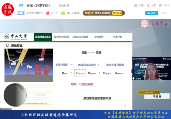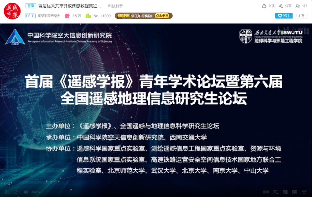 2021年9月25-26日,首届《遥感学报》青年学术论坛暨第六届全国遥感地理信息研究生论坛在知网、B站及科创中国线上平台举行。本次论坛由遥感学报、全国遥感与地理信息科学研究生论坛主办,每日大赛
