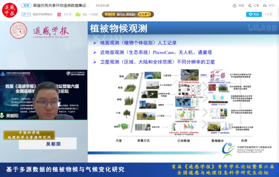 朱军教授主持。首先,来自中科院地理科学与资源研究所的吴朝阳研究员作为特邀嘉宾分享了“基于多源数据的植被物候与气候变化”的研究成果。他系统梳理了全球变化与植被物候两者之间的联系,并简述了植被物候观测的研究成果,包括冷激对春季物候的影响,昼夜温变化对秋季植被物候的相反影响等。