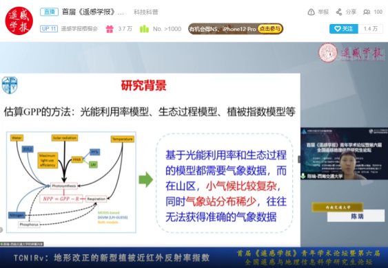的陈瑞同学针对NIRv易受山区地形影响的缺陷,提出了地形改正的新型植被近红外反射率指数TCNIRv。中山大学的冷宛春同学介绍了三极地区短波辐射的研究意义,并采用了查找表等方法进行短波辐射计算。